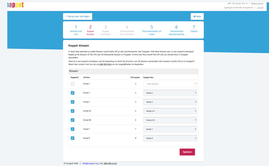 In stap 2 selecteer je welke klassen vanuit jullie LVS je wilt synchroniseren met Snappet. Dit zijn de klassen die met Snappet (gaan) werken. Vink deze klassen aan. De klassen die niet aangevinkt staan op deze pagina, worden niet overgenomen in Snappet.