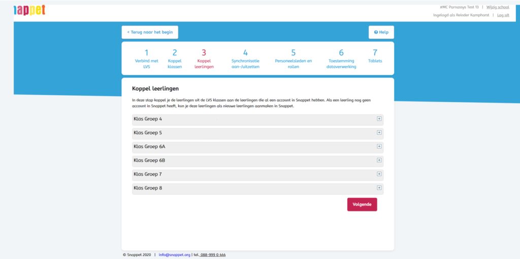 Als er geen melding staat achter de klasnaam, betekent dat dat we alle leerlingen vanuit LVS succesvol aan een Snappet account hebben kunnen koppelen. Indien we een leerling niet hebben kunnen koppelen, omdat bijvoorbeeld de schrijfwijze van de naam niet overeenkomt in de twee systemen, staat er ‘Selecteer een leerling‘. Voor deze leerling moet je zelf het juiste Snappet-account selecteren of een nieuw account aanmaken.