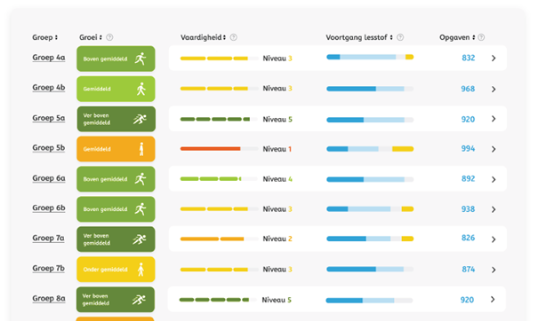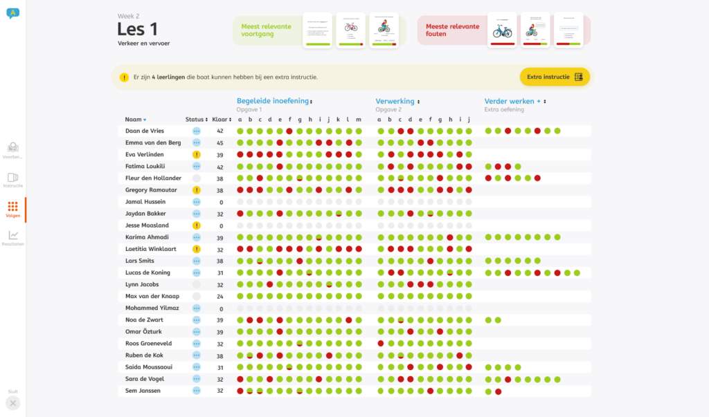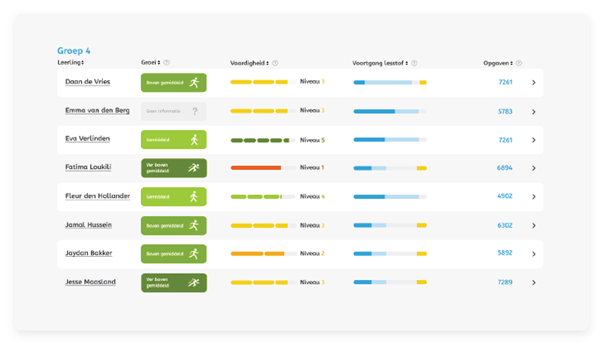 Tijdens de zelfstandige (adaptieve) verwerking in de les monitor je live de resultaten van leerlingen en kun je direct bijsturen. In de volgenpagina van de les monitor je de voortgang van iedereen uit je klas en bewaar je het overzicht.