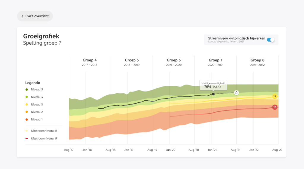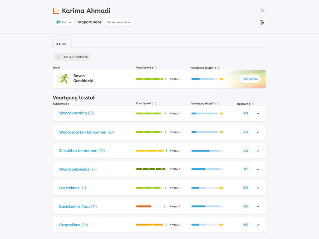 Toont de huidige groei en vaardigheid voor taal en spelling. En per subdomein de huidige vaardigheid, groei en voortgang lesstof van de leerling.
