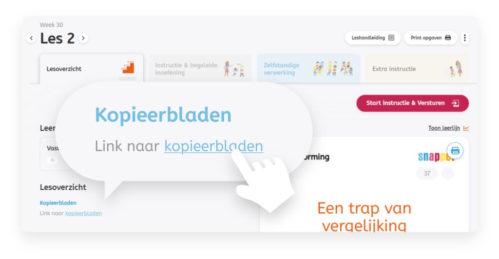 Bij de voorbereiding van je lessen worden er tips aan je gegeven bij de instructieopgaven. Zo word je als leerkracht stap voor stap meegenomen in de instructie en begeleide inoefening.