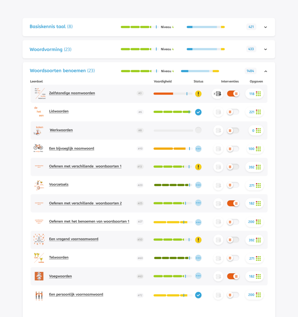 Daarnaast zie je in het klasoverzicht overzichtelijk hoe je klas zich ontwikkelt voor taal en spelling. Voor elke leerling wordt getoond hoe hij of zij er voor staat qua groei, vaardigheid, voortgang lesstof en aantal gemaakte opgaven.